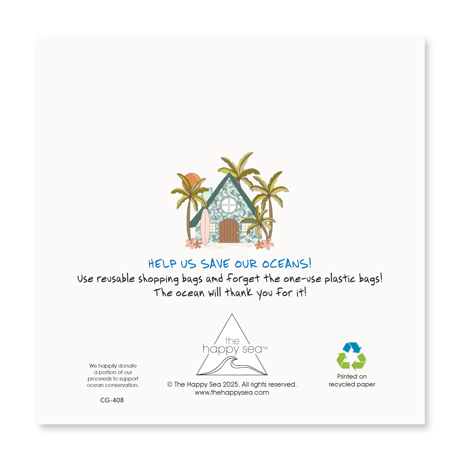 -Hand drawn illustration :) -Blank Inside -5"x5" -Professionally printed on 100% recycled card stock. -Paired with a 100% recycled white envelope & packaged plastic-free in a biodegradable clear sleeve. -Printed locally in the US. - A portion of all proceeds is donated to Orca Conservancy & other ocean conservation causes.